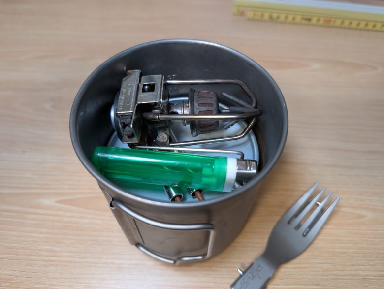 バーナー、ライター、カトラリーが全部入って、蓋も閉めれる状態になりました。ピッタリとスタッキングできて気持ちが良いです。