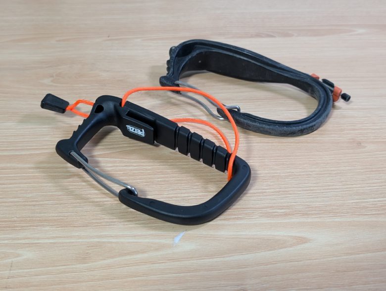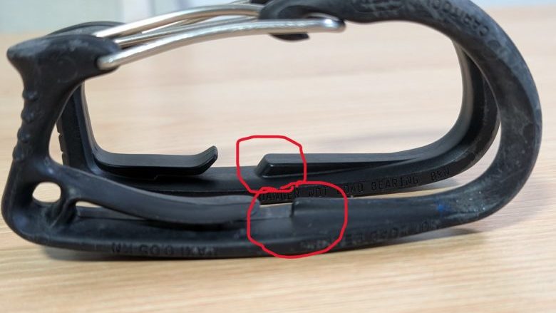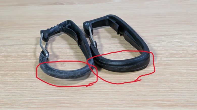 アイスクリッパースロットのあるハーネスに装着する際は、BDのアイスクリッパーの方が脱着が容易です。アイスクリッパースロットから外れにくくするために返し(写真赤丸)が付いているわけですが、キャリツールは返しが強く、なかなか外れません。