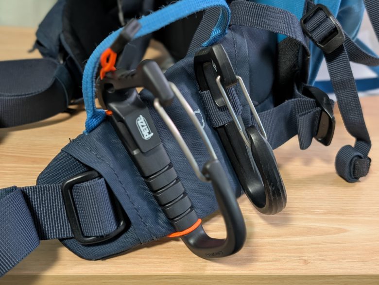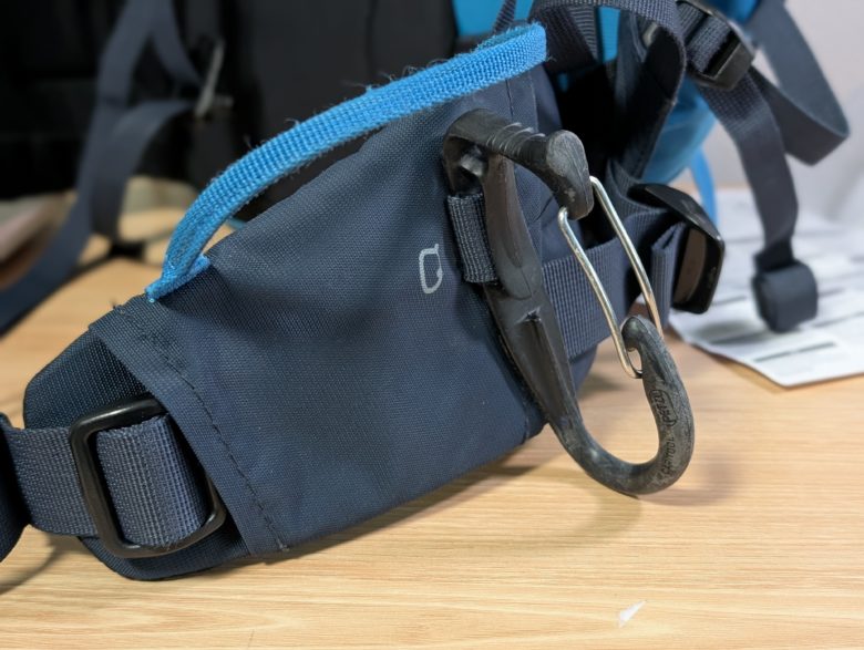 アルパイン向けのザックだと、ウエストベルトにアイスクリッパースロットがあります。キャリツールEVOはどこにでも装着できる点が最大の特徴です。