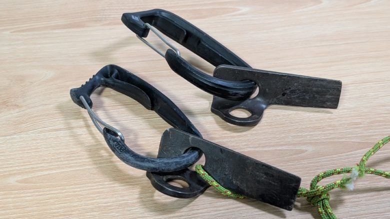 アイスクリッパーはアゴが太いのでハーケンとの相性が少し悪いです。ハーケンが引っ掛かるので、結局沢登りではキャリツールをメインに使いました。