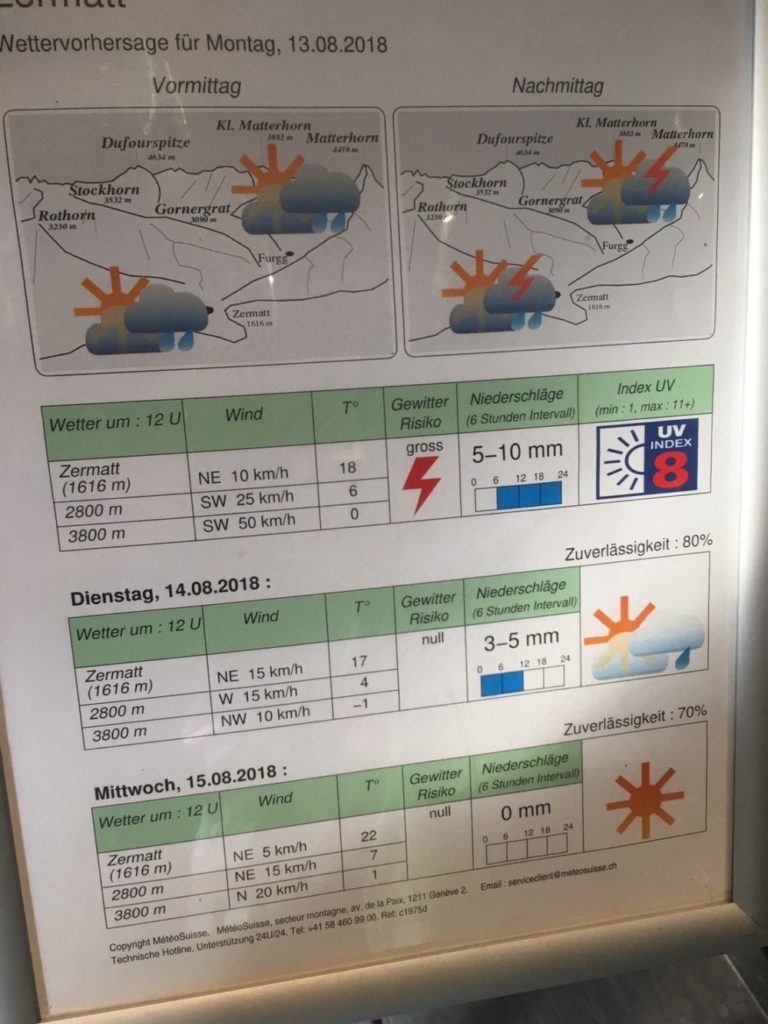 マッターホルンのガイド登山をする方は、こちらでお願いしましょう。僕たちはガイドレスだったので、ここには毎日天気予報を見に来ていました。最新情報を詳しく掲載してくれます。