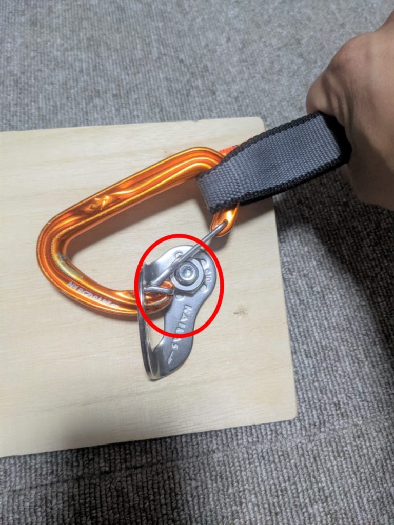 ロープ側のカラビナはゴムで固定されている必要があります。ゴムで固定されていないと、右の写真のようにカラビナがロープに釣られて横を向いてしまうからです。カラビナが動いてしまい、横向きになってしまうと7kN程度にしか耐えられないので破断する可能性があります。また、右の写真の場合だと、落ちた時にカラビナが外れます。