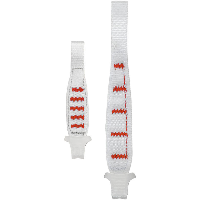 軽量でコンパクトなカラビナとダイニーマ製スリングを組み合わせ、重量とパフォーマンスのバランスが良いです。窪みが入ったストレートゲートはクリップしやすく、キーロックは引っ掛かりを防ぎます。スリングは異なる幅で握りやすく、頑丈なスリングプロテクターがロープ側のカラビナの回転を防いで摩耗を抑えます。鮮やかなオレンジ色のインジケーターで、スリングとプロテクターがカラビナに取り付けられているかどうか簡単にチェックできます。