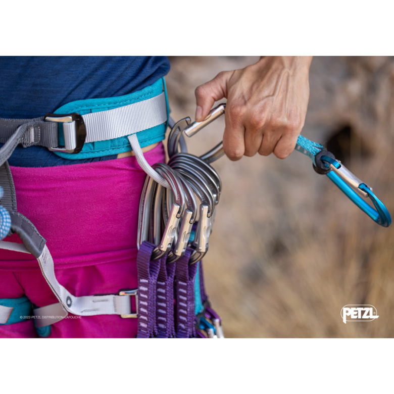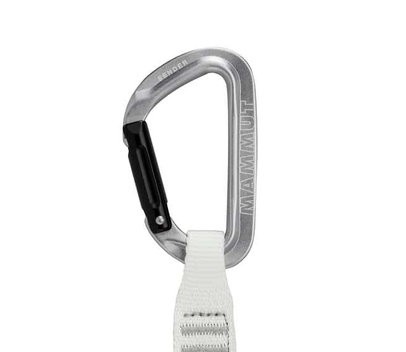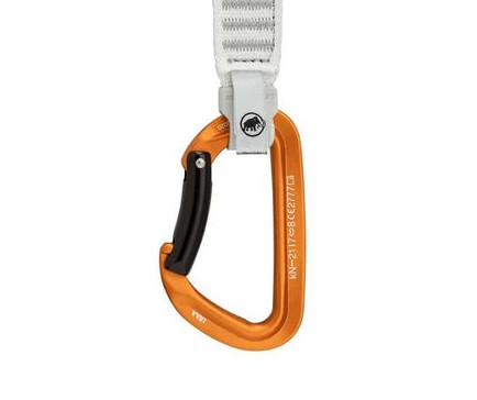 カラビナは幅22mmと扱いやすいサイズです。71グラムと非常に軽量で、ダイニーマ性のスリングは吸水しないので、冬山や沢登りでも扱いやすいです。ノーズが細いキーロックタイプなので、アルパインでも活躍します。