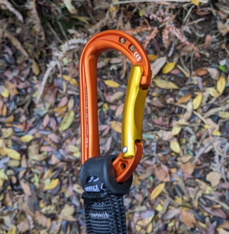 アルパインヌンチャクに使うなら、引っ掛かりのないカラビナがおすすめです。アンクリップ(カラビナからロープを外すこと)する際も、ロープに引っ掛かるのでマルチピッチのフォロワーなどは少し困ることがあります。できれば、支点側もロープ側も引っ掛かりが無い方が使いやすいです。