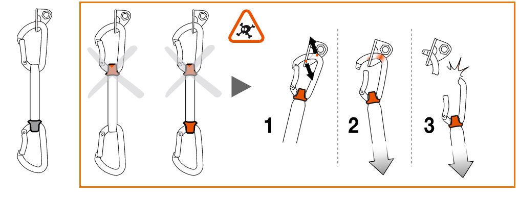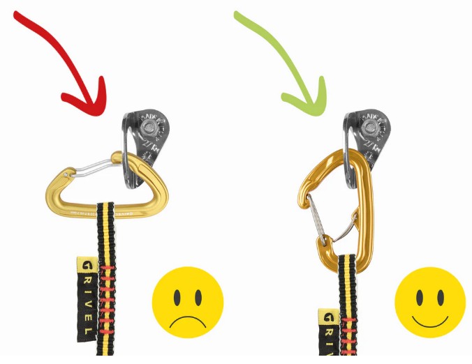 リードクライマーの動きにつられカラビナが回転する事により、ハンガーからカラビナが外れてしまう可能性があります。カラビナがゴムで固定されていると、より外れやすくなるので注意が必要です。この現象を防ぐには、ゲートの向きをクライマーが進む方向と反対側にすると良いです。