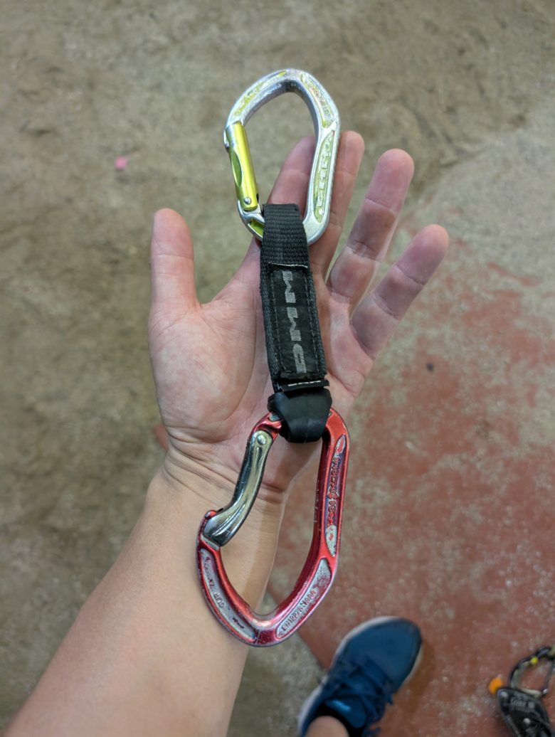 クイックドローには向きがあります。固定されてなく自由に動くカラビナは支点側です。ロープを通すカラビナはゴムで固定されていることが多いです。支点側をロープ側で使用してはいけません。