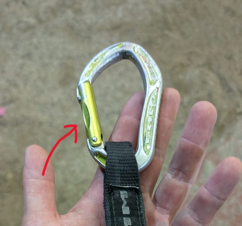 ストレートゲートはノーズの段差が少ないのでミスオープンしにくいです、必ずミスオープンをしない訳ではないので、クライマーが進む方向とゲートの向きを反対にすることを徹底しましょう。