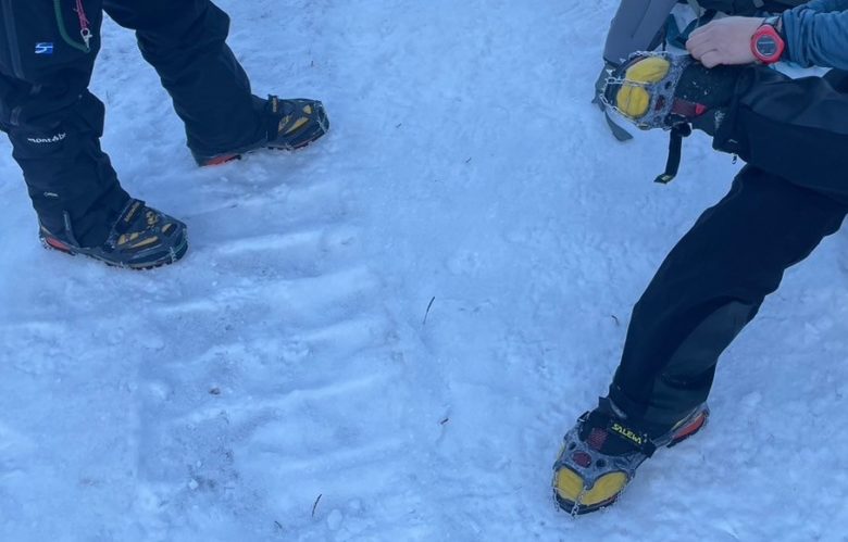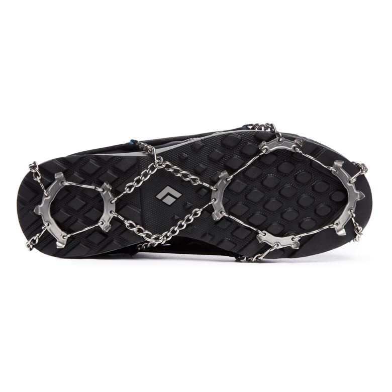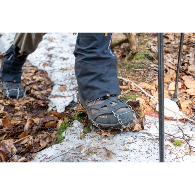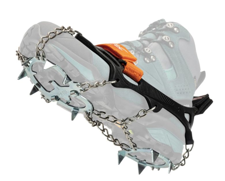 カチカチに凍った道を滑らずに歩くには、チェーンスパイクが最も歩きやすいです。チェーンスパイクは靴への装着が簡単で、スピーディーに装着できます。雪山に行くなら持っておいて損のないアイテムです。