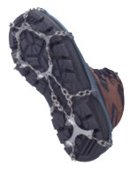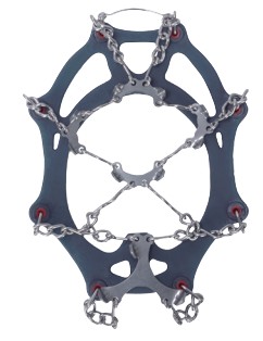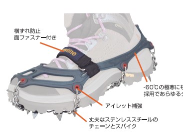 オールラウンドなチェーンアイゼン。雪や氷が消えた医師や岩の上を歩いてもチェーンが切れたり曲がったりする心配がありません。スノーラインは世界で最初にスパイクをチェーンでつなぎゴムバンドで装着するアイゼンを考案して実用化しました。