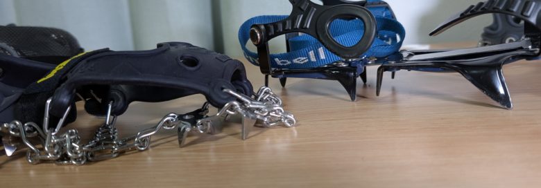 アイゼンは雪の多い道で使います。凍った道にも強いです。装着に時間はかかりますが、一度装着してしまえばズレにくく、チェーンスパイクよりも強いグリップを得られます。全体的に爪が長いので、多少の歩行技術が必要です。