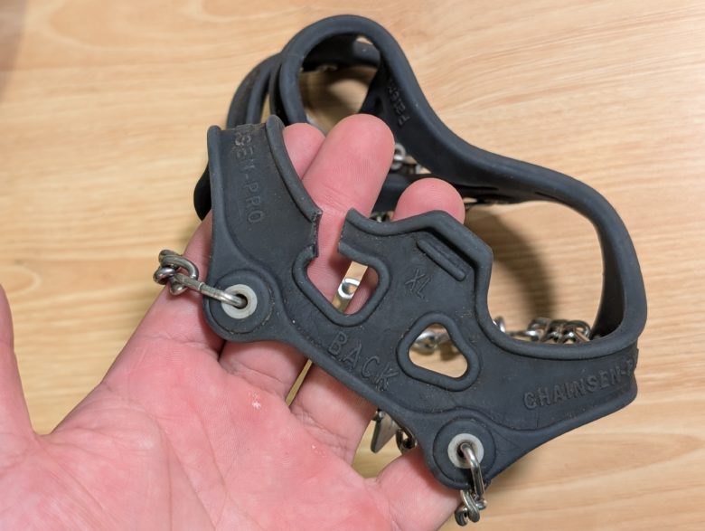 チェーンスパイクの寿命を決めるのは、ハーネス部分のゴムの太さや品質です。ゴムの素材はエラストマーやシリコーンなどが使われています。Amazonなどで売られている安価なチェーンスパイクは、使用一回で切れるなどの事例もあるようです。