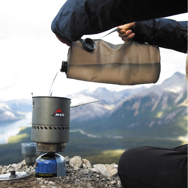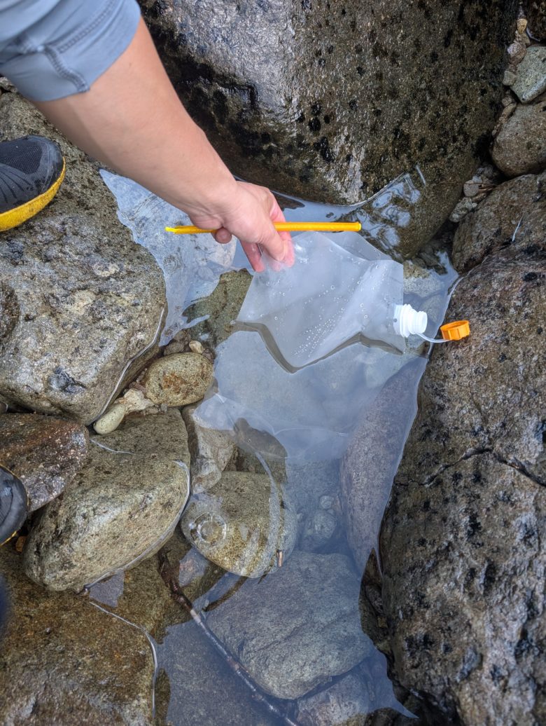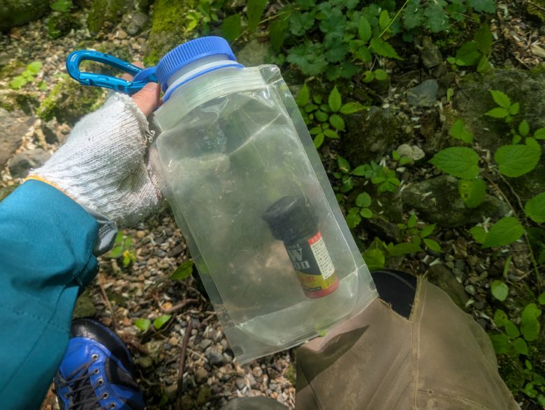 浅い沢から水を汲むときは、水筒の口が大きい方が効率が良いです。ウォーターバッグは沢の水頼りのテント泊に必須の水筒です。帰ってからのお手入れも簡単です。