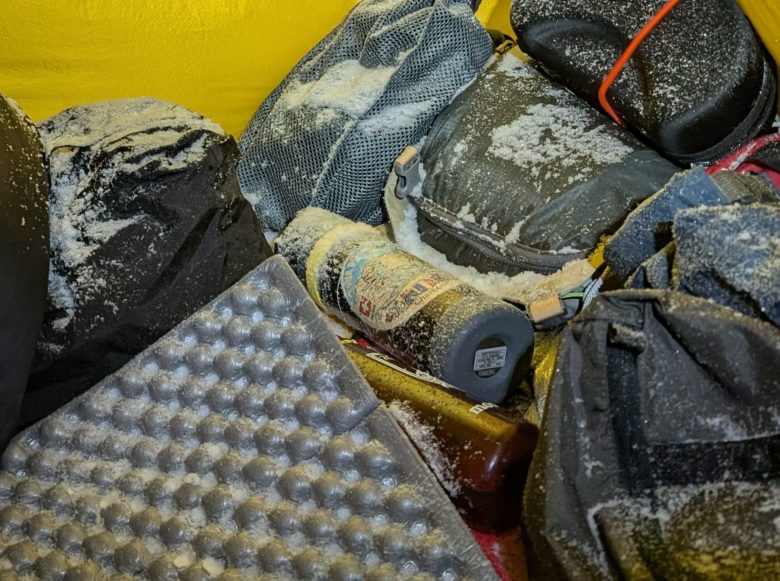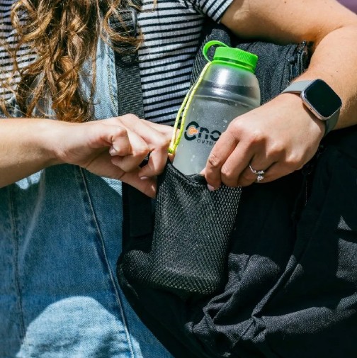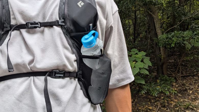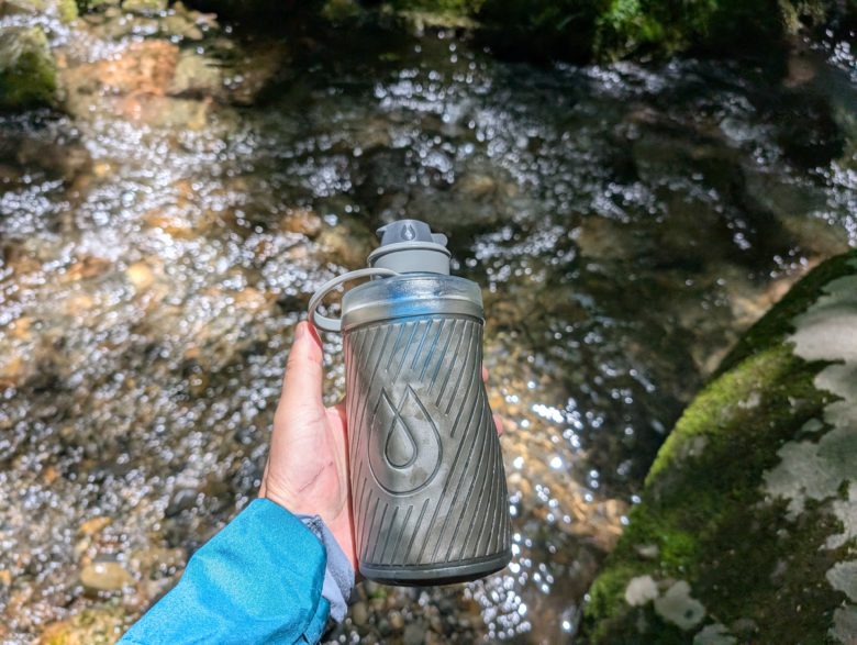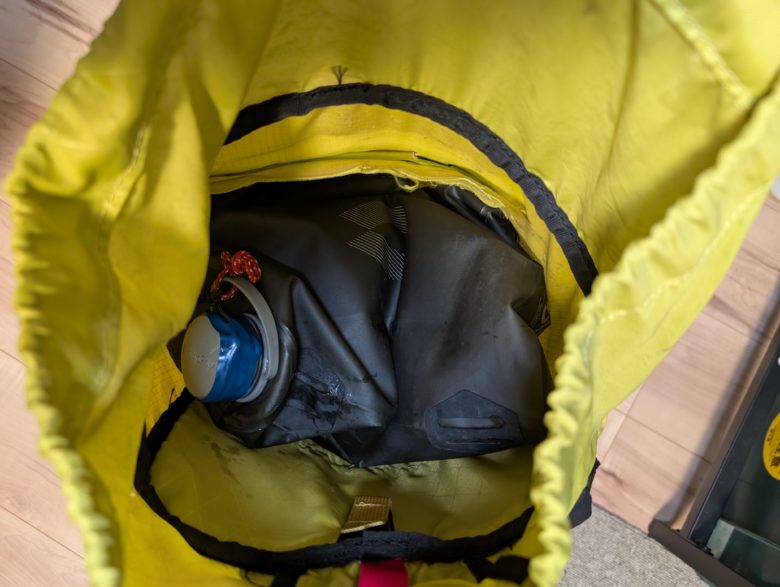 荷物がパンパンに入った雨蓋に水筒を入れたい際にも、ソフトボトルの柔らかさは役に立ちます。ザックのサイドポケットにも収まりが良いですが、落とさないような工夫は必要です。