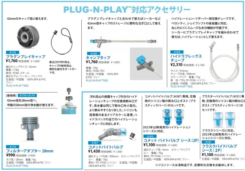 ハイドラパックから便利なオプションパーツが販売されています。中でもおすすめなのが、キャンプタップとプラグンプレイキャップです。プラグンプレイキャップを42mmの水筒に装着し、キャンプタップを装着すると便利な注ぐ口になります。水をこぼしたくないテント泊などで便利です。
