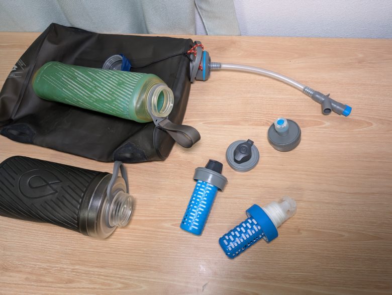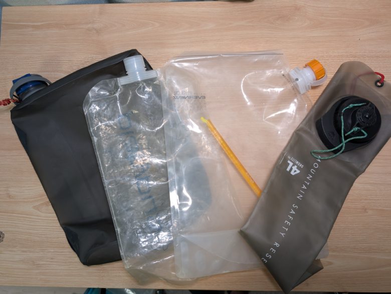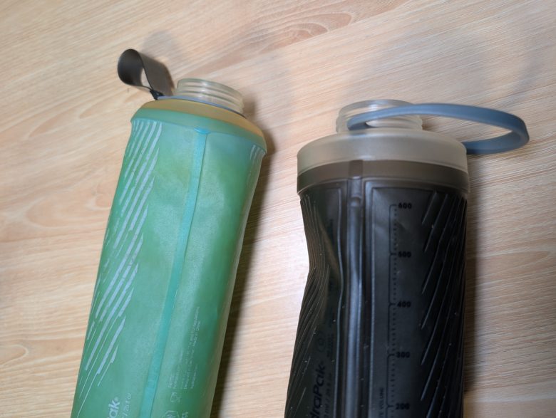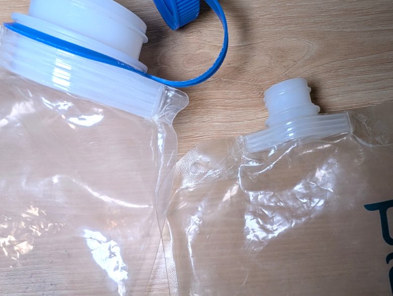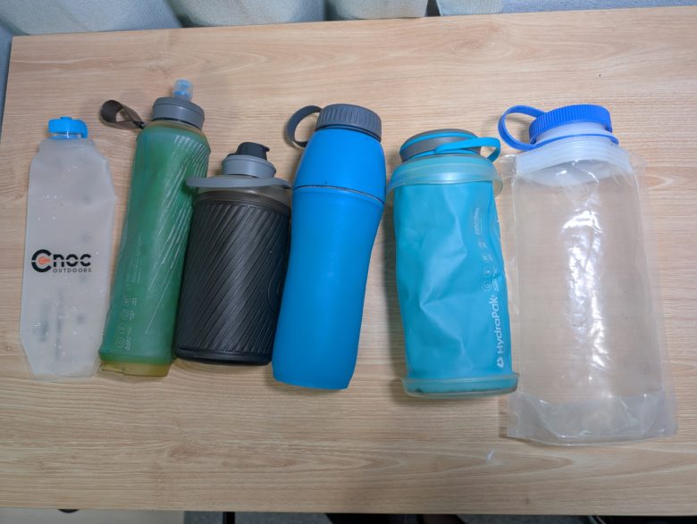 種類やオプションパーツが最も多いのはソフトボトルタイプです。素材にもよりますが、何度も折れ曲がるようなところは細かな穴が空いたりします。しかし、数年使って穴が開くかどうかなので、それほど心配する必要はありません。左から2番目のボトルは購入から6年ほど経っていますが、未だに穴が開く気配はありません。
