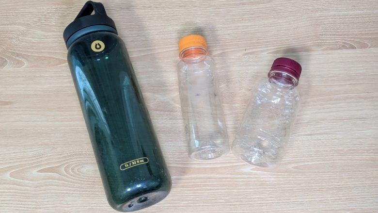 ナルゲンボトルに代表されるプラスチックボトルです。耐久性が高く、水が汲みやすい点がプラスチックボトルのメリットです。デメリットは、口が大きいため少し飲みにくいという点です。プラスチックボトルは各メーカーから販売されています。メーカーによって使用感は結構違うので解説します。